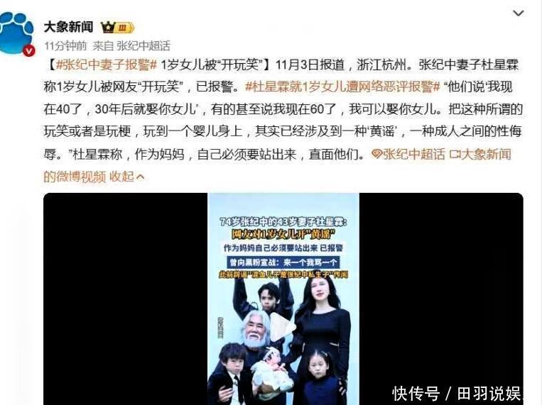 张纪中的妻子杜星霖在11月2号公开发声,说这件事不是玩笑,而是对小婴儿的造“黄谣”,还带着成人之间的性侮辱,完全踩破了为人父母的底线。